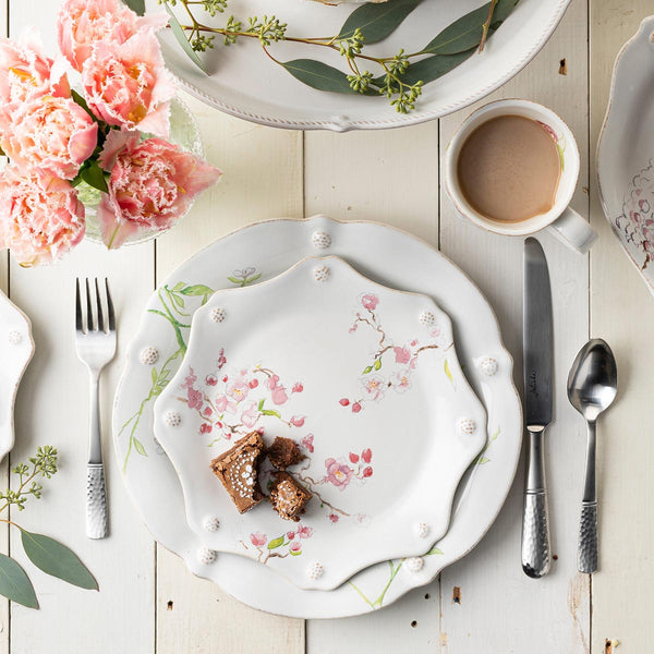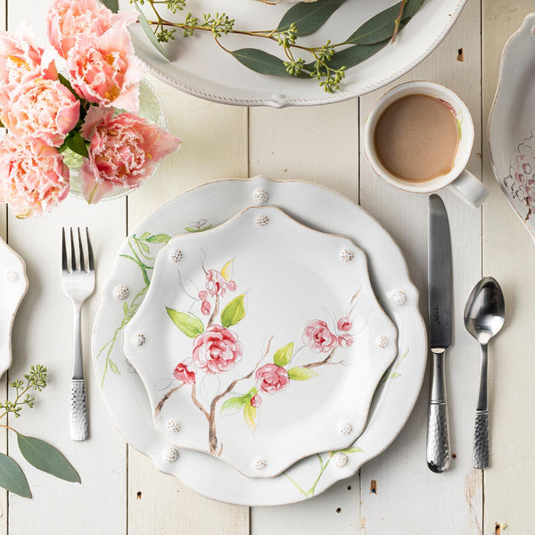 Complete with our thread and berries design, these charming, scalloped dessert/salad plates make for mix n' match fun in our new, lovely dinnerware blooms featuring jasmine, cherry blossom, camellia and wisteria flowers. Gift boxed.
