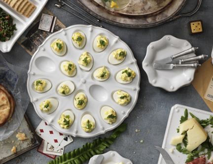 From our Berry & Thread Collection - Display your Deviled Eggs in this platter that boasts a scalloped rim replete with our rustic thread and berry motif, and take it to your next potluck.
