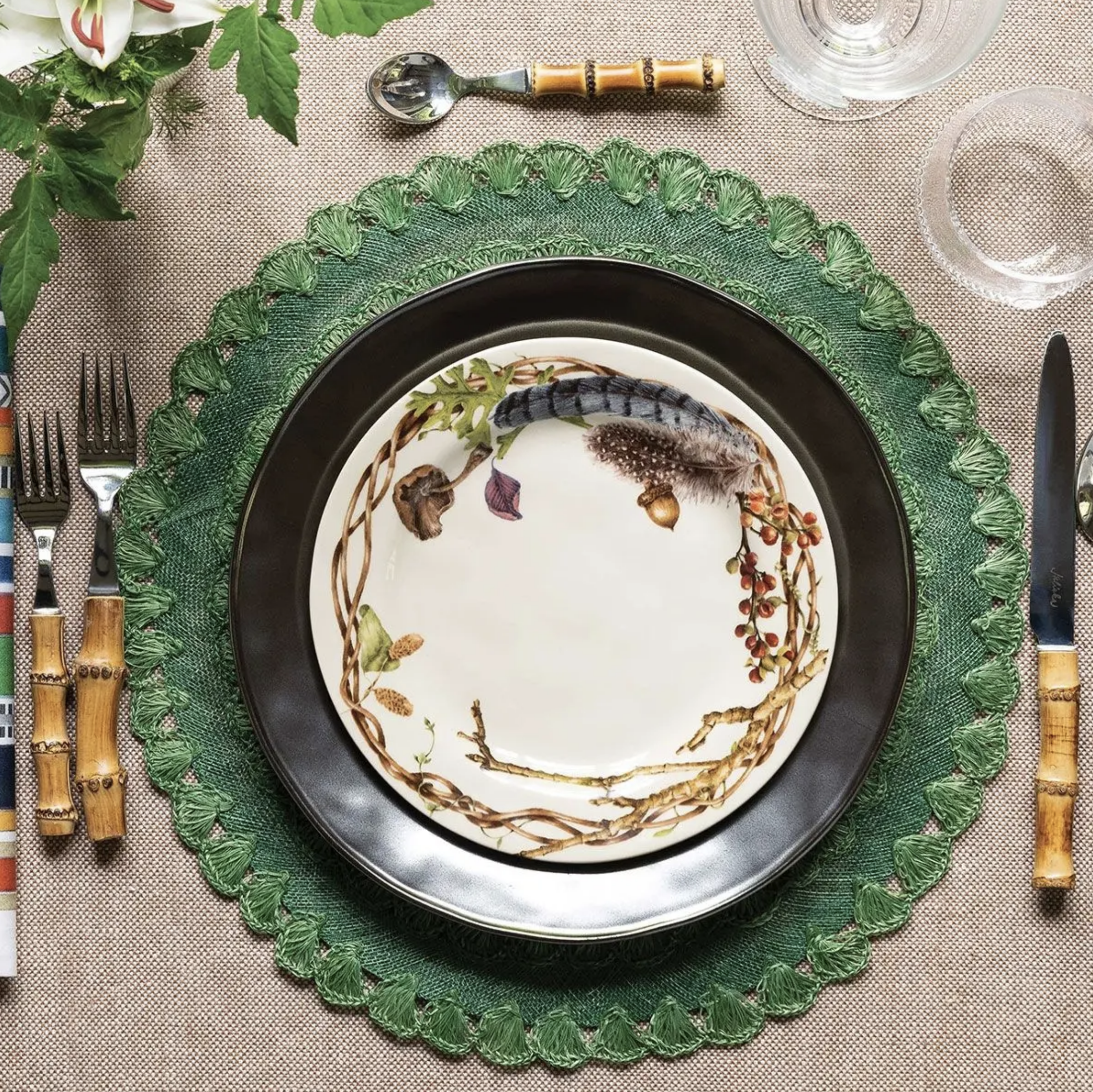 From our Forest Walk Collection- Found treasures from woodland rambles are artfully arranged in a coronet of wildly beautiful things - making a fine nest to frame your main course.