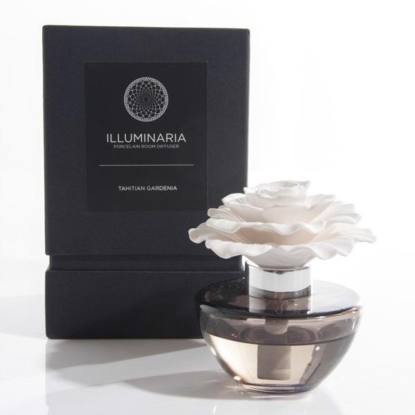 Illuminaria Porcelain Diffuser Porcelain figure extends down into the liquid fragrance and wicks up scent that diffuses into the room from the surface area of the porcelain figure. Simply remove the porcelain figure, pour the fragrance into the glass bottle, replace the porcelain figure and sit back and enjoy the fragrance 24 hours a day for months. Do not place porcelain diffuser on furniture or counter top without a protective tray.